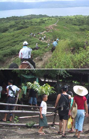 先週土曜日に行った「タール火山ツアー」の続きです。火口湖を見下ろす展望台で 風に吹かれていると、少し雨が降ってきました。本降りになる前に、と引き返し始 めたのですが、幸いパラパラ降っただけで本降りにはなりませんでした。今はまだ 雨季だから、出かけて天気がいいかは運次第ですね。ほかの熱帯の国では雨季とい っても、雨が短時間だけ降ってすっきり晴れる気候の所もあるんでしょうが、ここ では雨季の雨の日は一日中曇っていて雨が降ったりやんだりの繰り返しってことが 多いです。